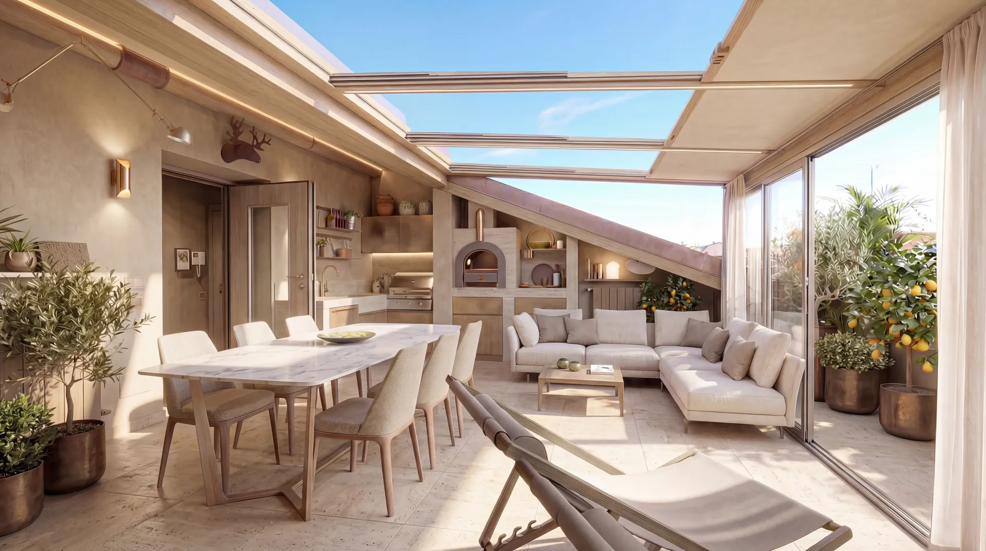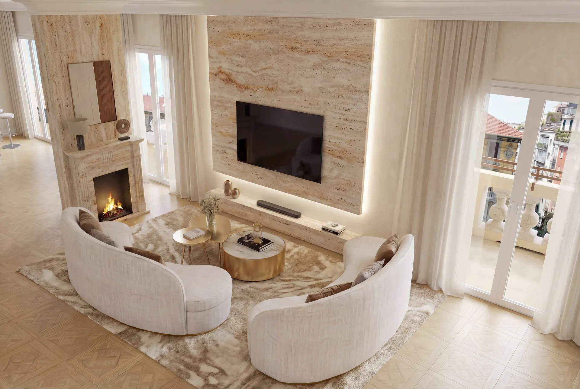 A meticulously renovated ground-floor residence in a 1925 Liberty palazzo, with 135 m² of private outdoor space including spa, plunge pool and outdoor kitchen.
